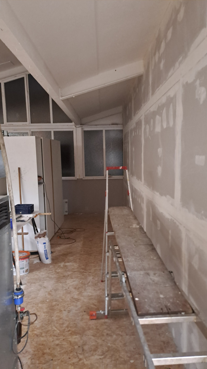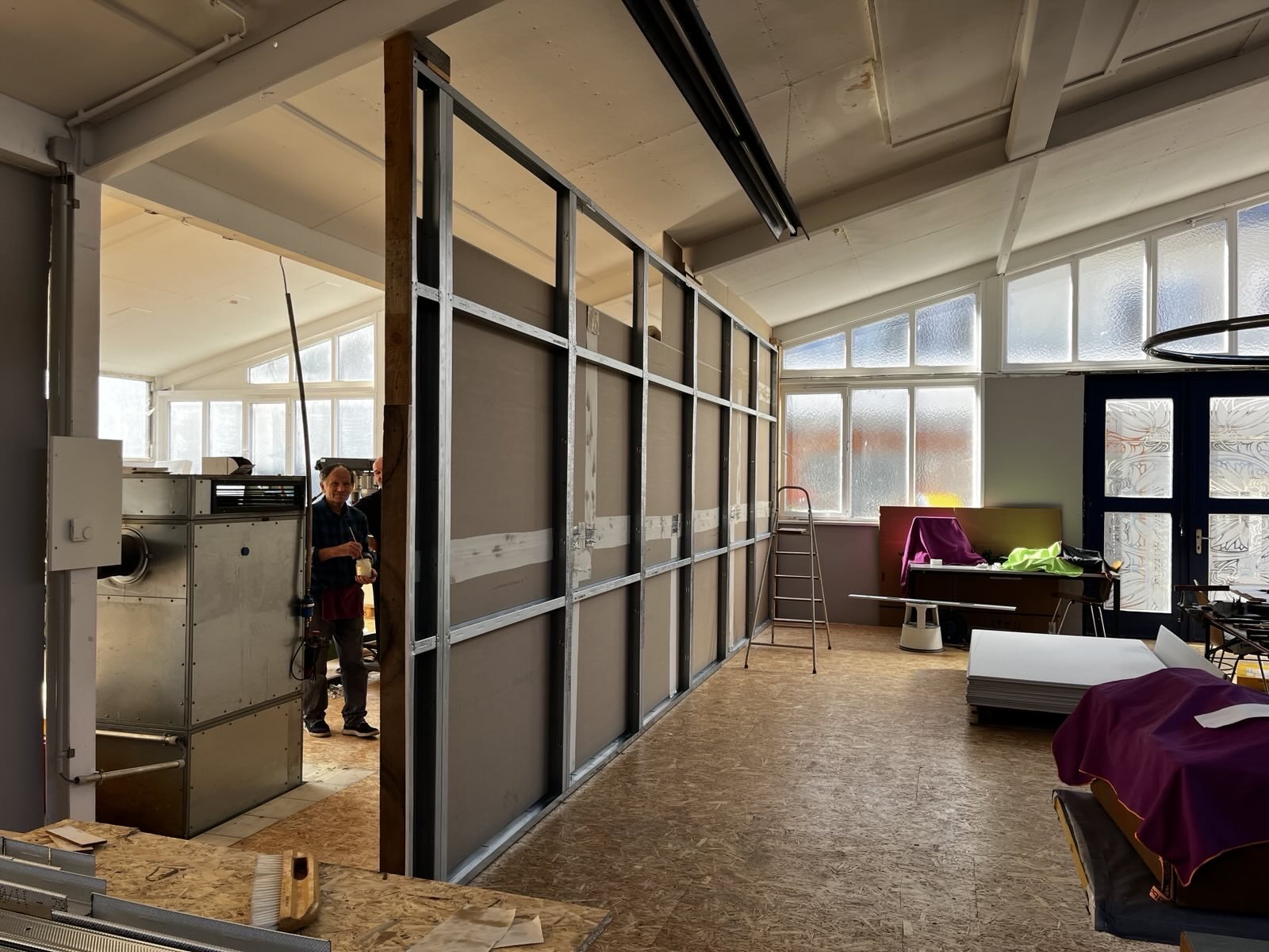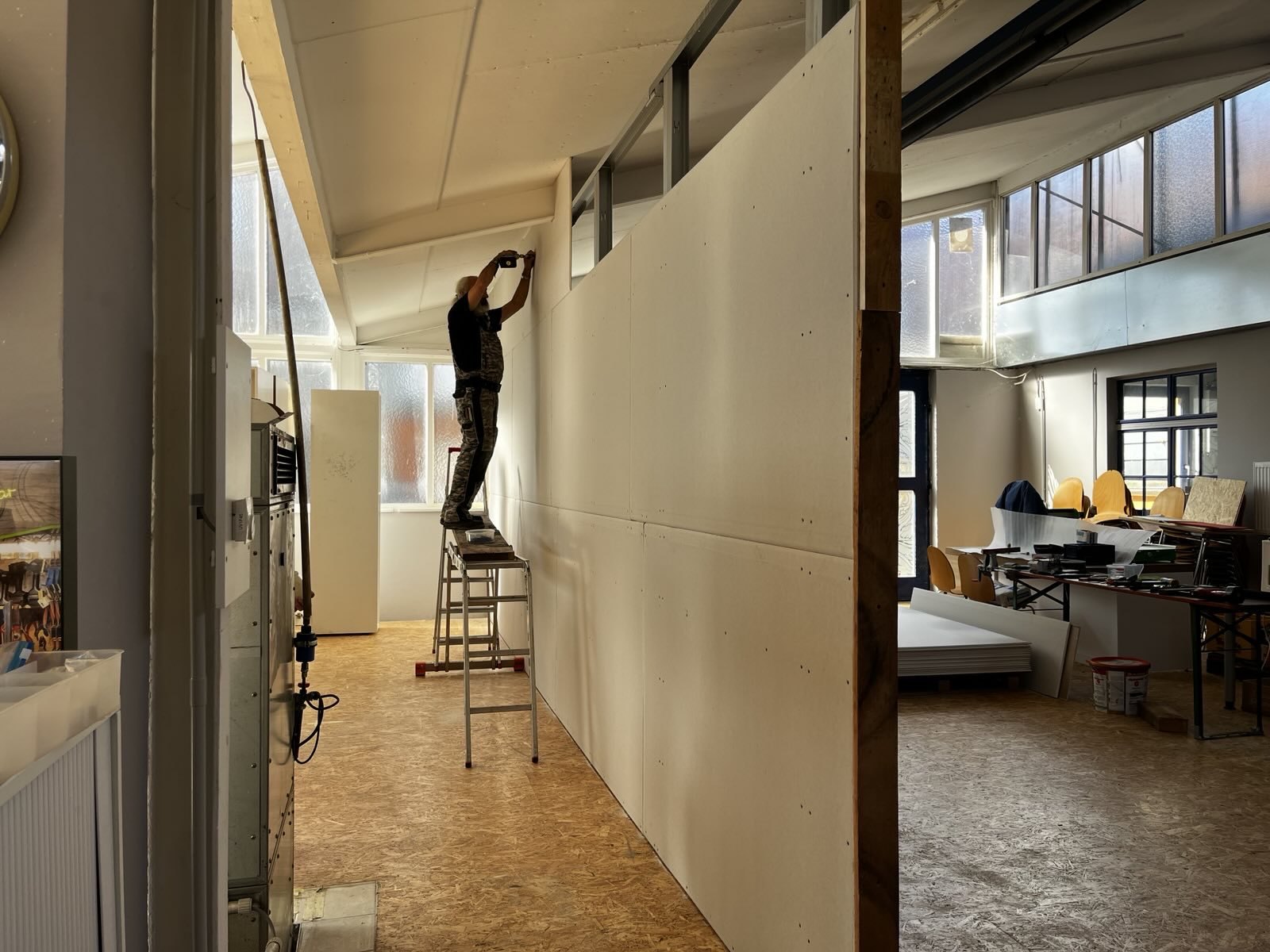 Alktuell ist die Trennwand zwischen Kulissenbau und dem Fablab im Bau: es fehlt noch die Wandplatten auf der Seite des Kulissenbau und die Verlegung von Stromkabeln und Steckdosen; am Ende der Wand wird ein Verteilerkasten installiert.